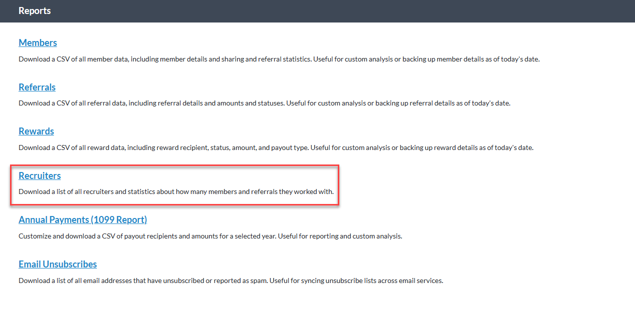 Recruiters are team members (sales reps, customer service, field reps, etc.) who help grow your referral program by signing up new members during 1-on-1 interactions.