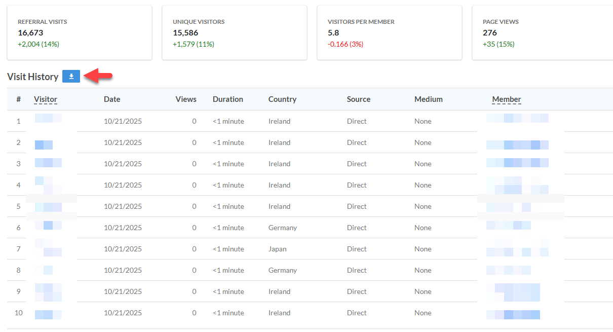 A member visit tracks when a member (or potential member) interacts with your referral program, whether logged in or not.